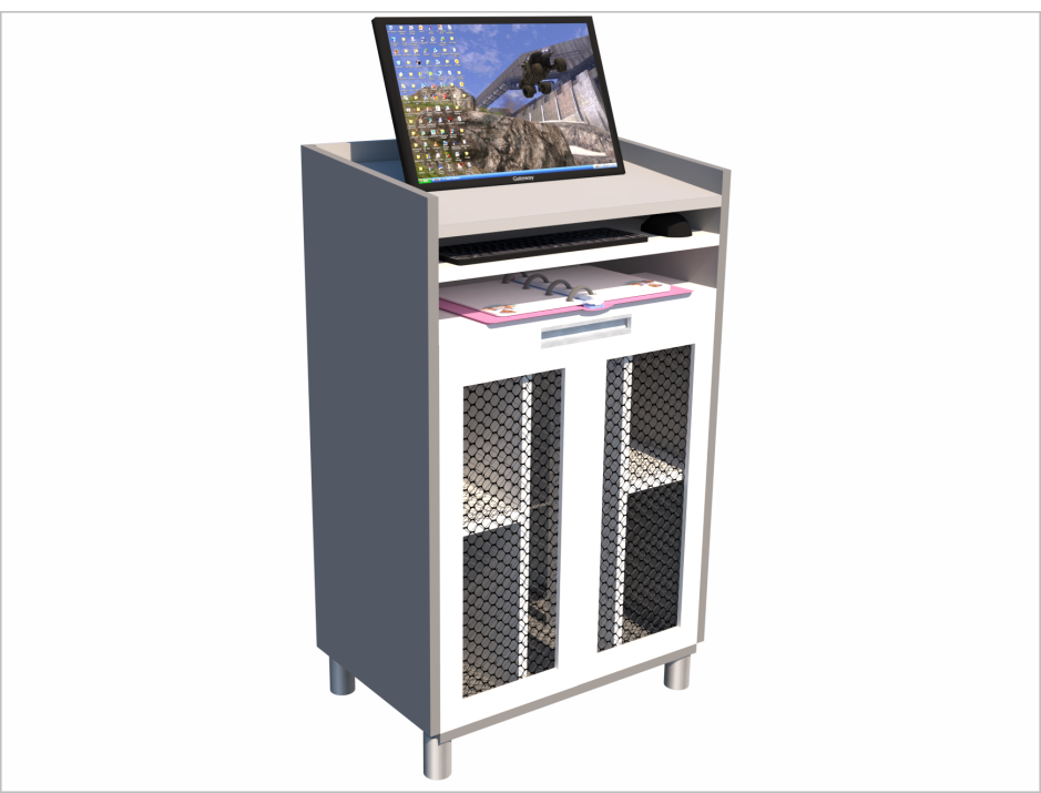 Mini Balcão Atendimento Express, Tampo Vidro 8mm. Em mdf. 02 portas com tela para ventilação. Local para CPU e nobreak Medidas: Frente 0,90x altura 1,00xprof: 0,55m. pés de aluminio. Possibildades para rodinhas